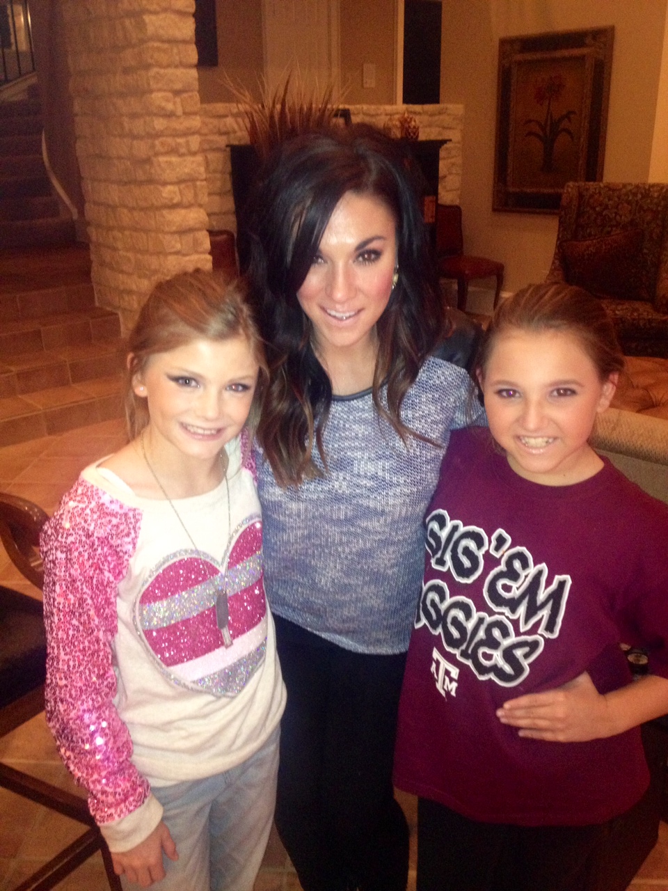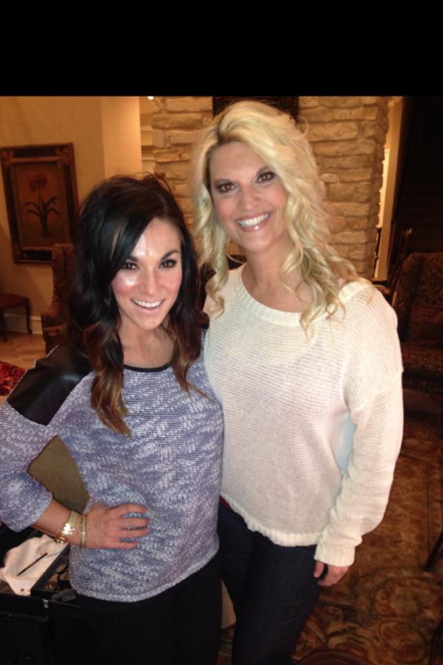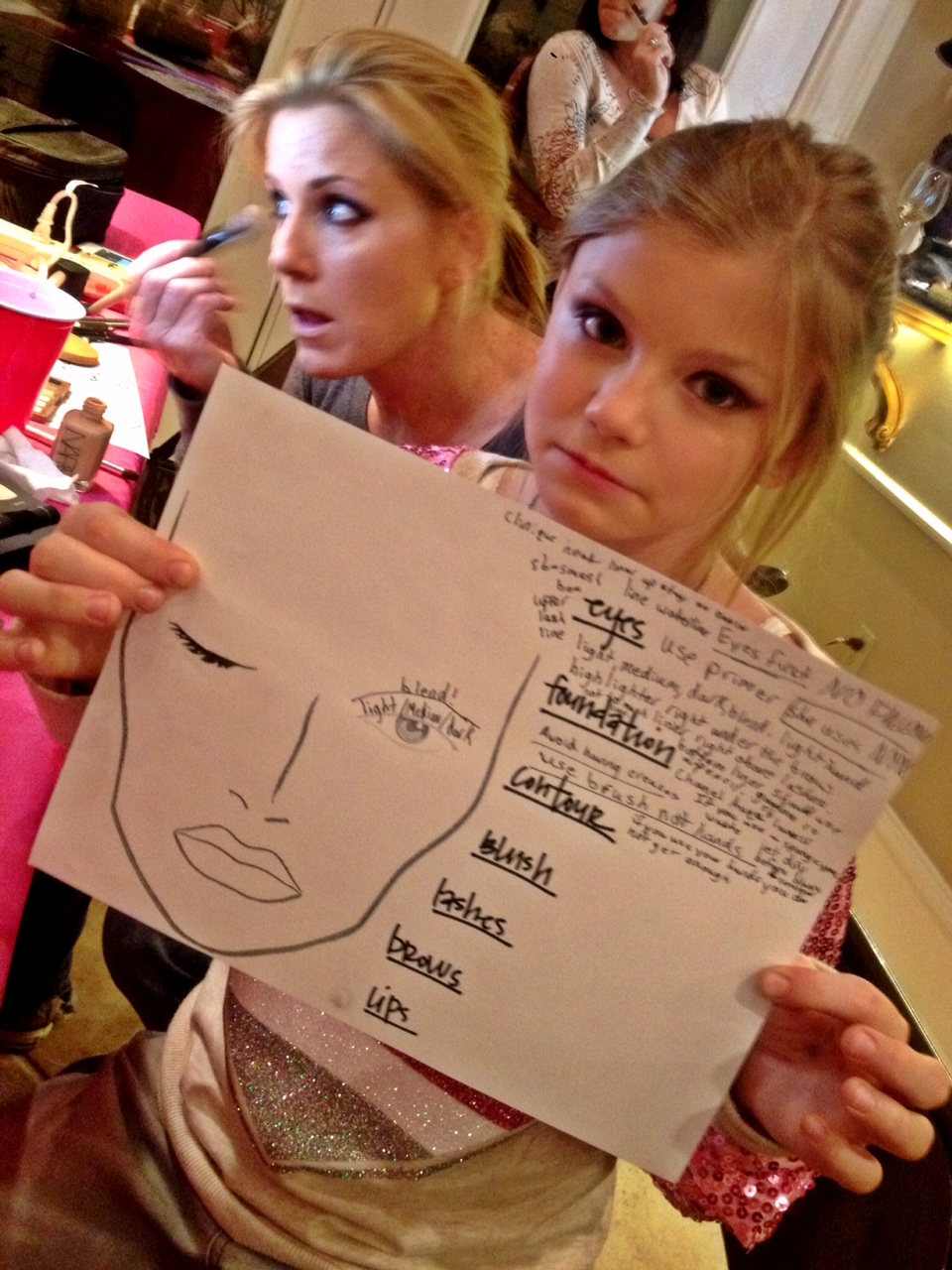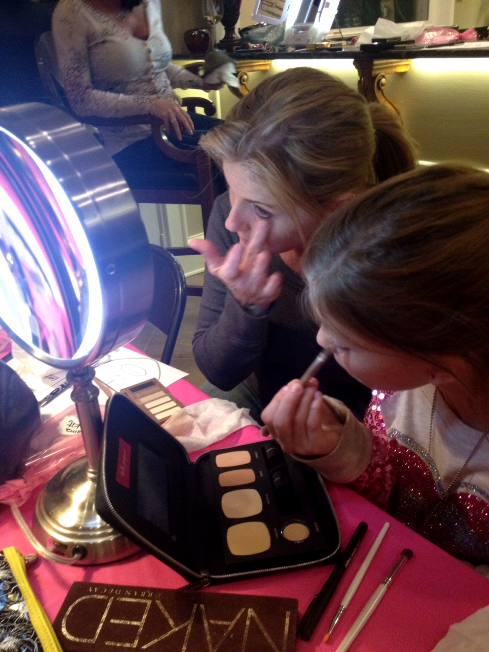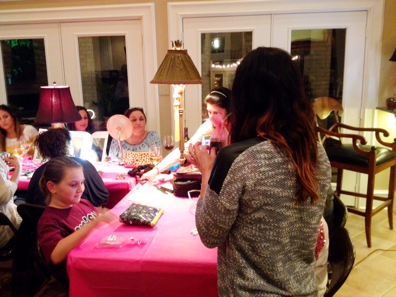 My host asked each of our guests to bring their own their own makeup kit and a bottle of wine while she provided dinner …. we mixed, mingled and gabbed then got seated for the pretty lesson to begin! She set up 8-foot tables and had extension cords so everyone could plug in a mirror at their “station.” One of my bff’s Miki was my demo model and for two hours we talked technique, tools and how-to’s for the perfect smokey eye! We wrapped the session with a lesson in contouring and how to apply falsies! I got tons of great feedback – everyone told me how much they learned – and that’s the point! The girls asked amazing questions, took notes on their face charts and really got hands-on for the whole event! Here’s a few iPhone pictures we snapped along the way! Ten adults and two kiddos (who agreed they would totally do their makeup this way when they got older) was a great size group!