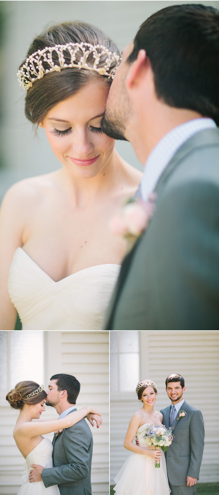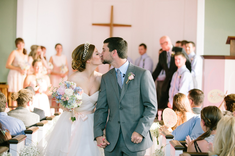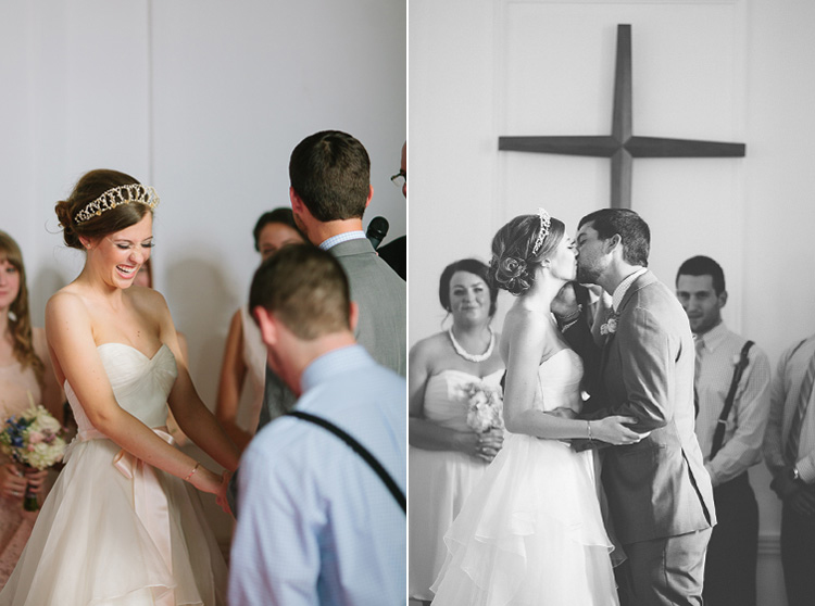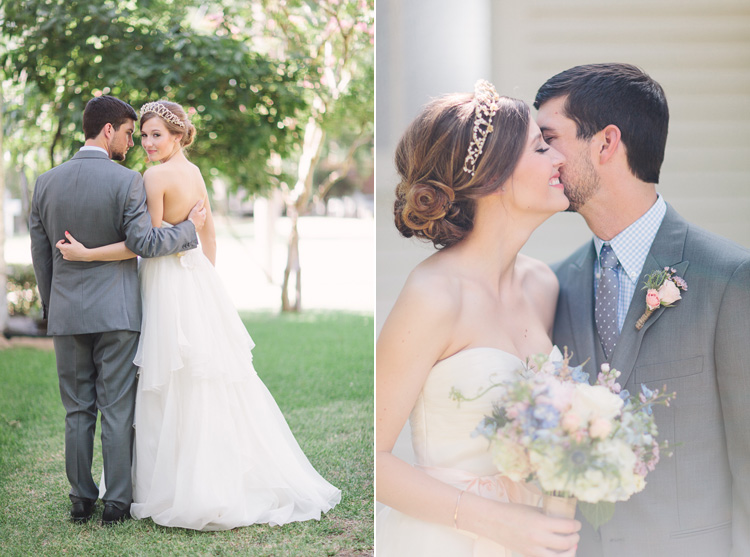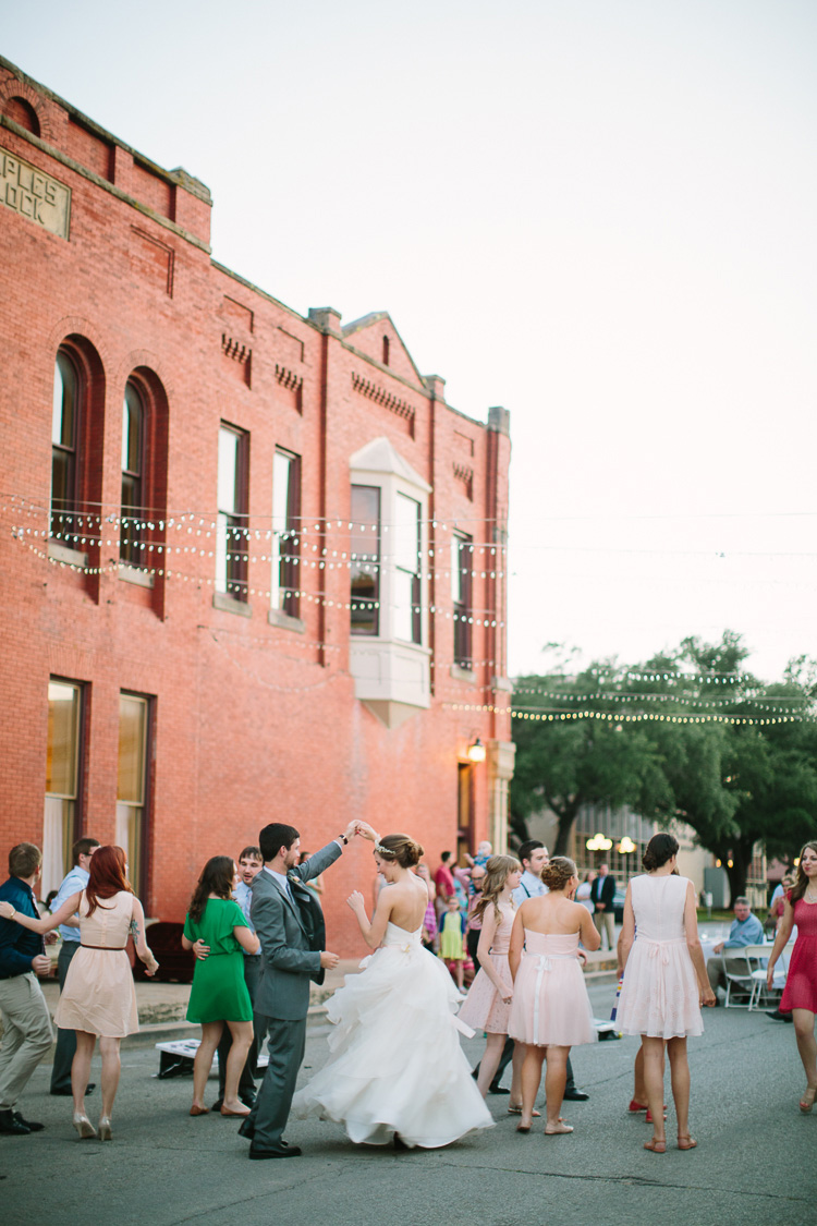 Little white church with a steeple on the corner of Mulberry Street (in Kaufman, TX) for the ceremony, old town square bank building converted into a venue space for the reception, an antique french crown on her head, and a party that ended with dancing in the streets – clearly you can see why I love this vintage-chic wedding so much! Enjoy this adorable wedding and all the bridal beauty below!