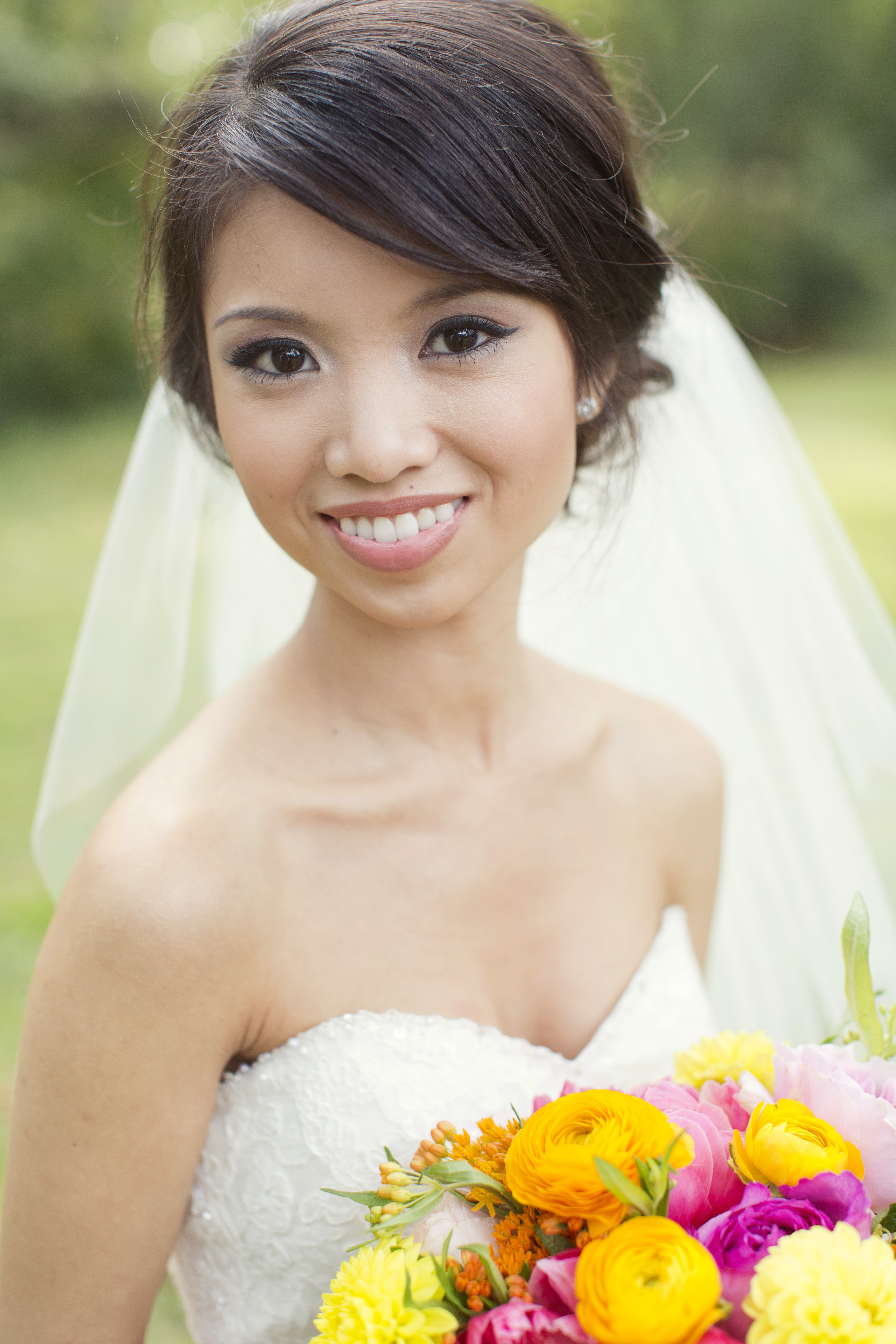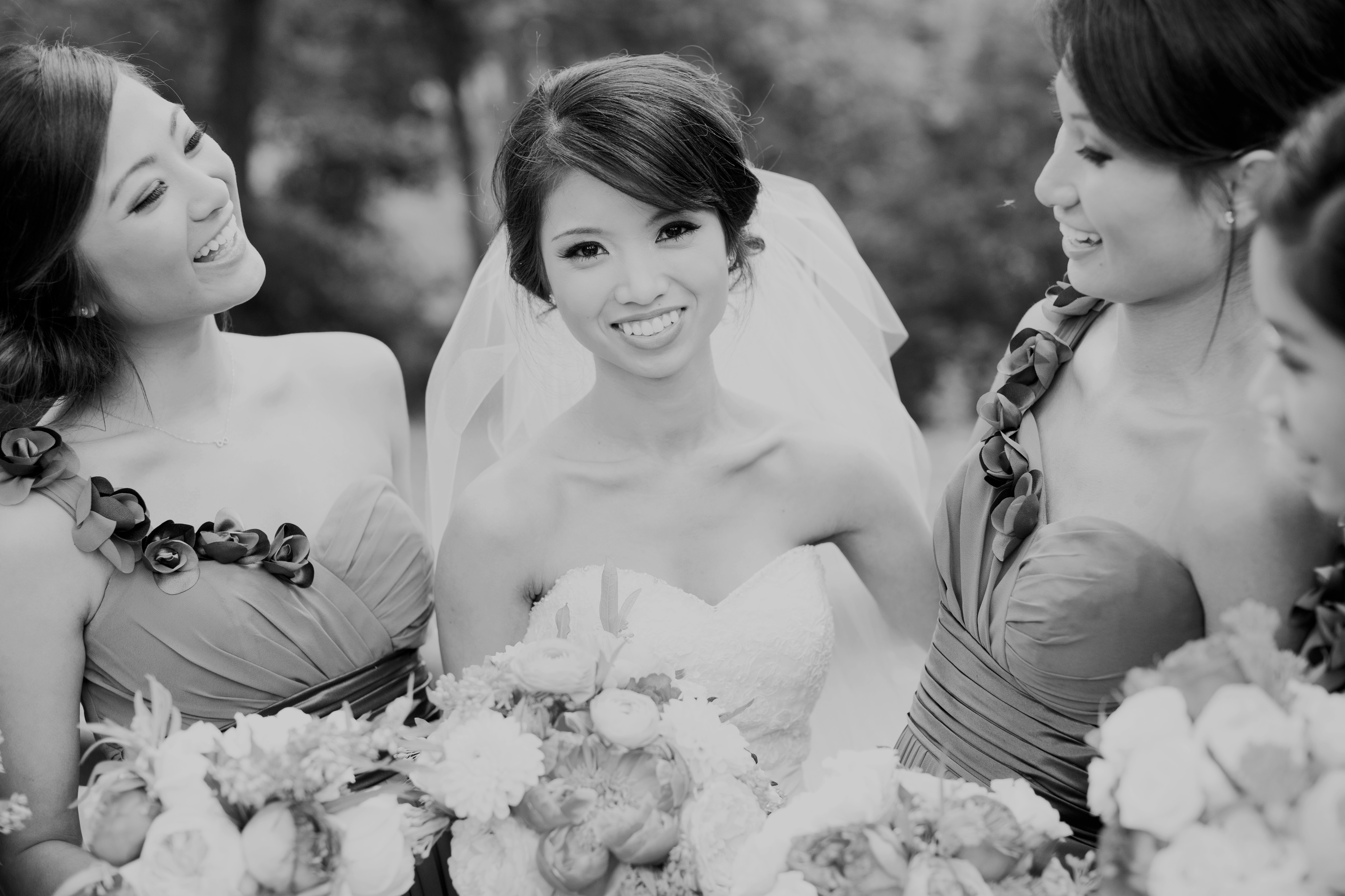 I absolutely adore this beautiful bride (and her glamorous style)! We did a bronze & mauve colored palette on MihnTu’s eyes with winged liner, flawless skin and a pretty pink lip and a big, full updo. Her bridesmaids all requested really fun, great looks (see bold-eyed bridesmaid below) and updos all around! Such a beautiful group! Enjoy theses gorgeous images by the lovely Sarah Kate, Photographer!